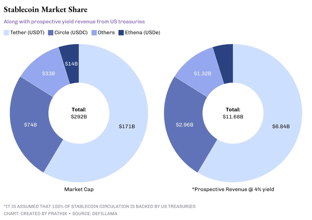 Durante años, USDT y USDC fueron el “ducto” principal de liquidez en DeFi. Protocolos construían encima, traders apalancaban, y Tether y Circle, sentados cómodamente, cobraban la renta: el rendimiento de las reservas invertidas en bonos del Tesoro. El negocio más simple y rentable del mundo.